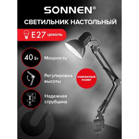 Цена на Лампа настольная Sonnen светильник на рабочий стол с цоколем Е27 на струбцине 40 Вт высота 50 см - 1053 ₽.