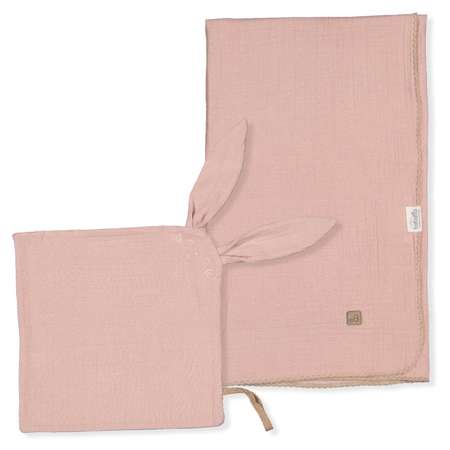 Набор из двух предметов для девочки из 100% хлопкового муслина розового цвета. Одеяло размером 85 см на 80 см, край с декоративной отстрочкой, логотип бренда, скругленные углы. Комфортер-пеленка размером 25 см на 25 см, с вышивкой мордочкой зайчика, длинными ушками и петелькой для удобства использованияЦены в интернет-магазине могут отличаться от розничных магазинов.