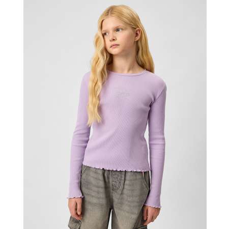 Лонгслив для девочки Futurino сиреневого цвета с декором из страз в виде бабочки.