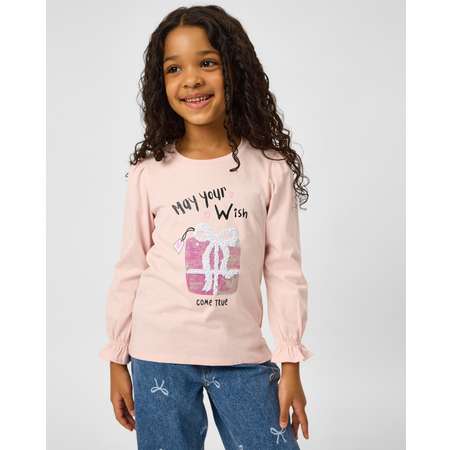 Светло-розовый лонгслив для девочки Futurino, декорированный принтом с пайетками.