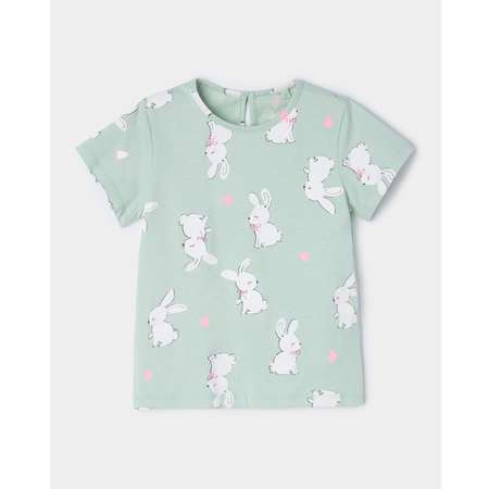 Мятная футболка для девочки BabyGо, декорированная принтом с зайчиками.