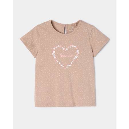 Бежевая футболка для девочки BabyGо в горошек. Декорирована цветочным принтом с блёстками.