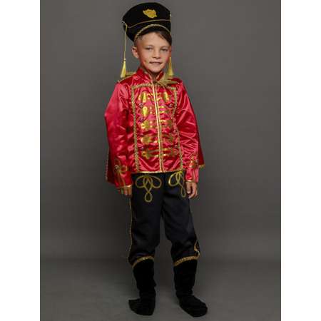 В карнавальном костюме "Гусар" легко почувствовать себя лихим воякой, рвущимся в бой. Такой яркий образ обязательно понравится всем мальчикам. Отлично подойдет для спектаклей, представлений, маскарада или детского утренника. Костюм, состоящий из мундира, кивера, брюк с сапогами и плаща, будет прекрасно смотреться на мальчике любой комплекции. Дополнен костюм пластиковой саблей.