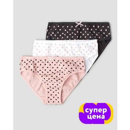 В комплекте Futurino три модели трусов для девочки, декорированные принтом с сердечками - розовые, белые и тёмно-серые.