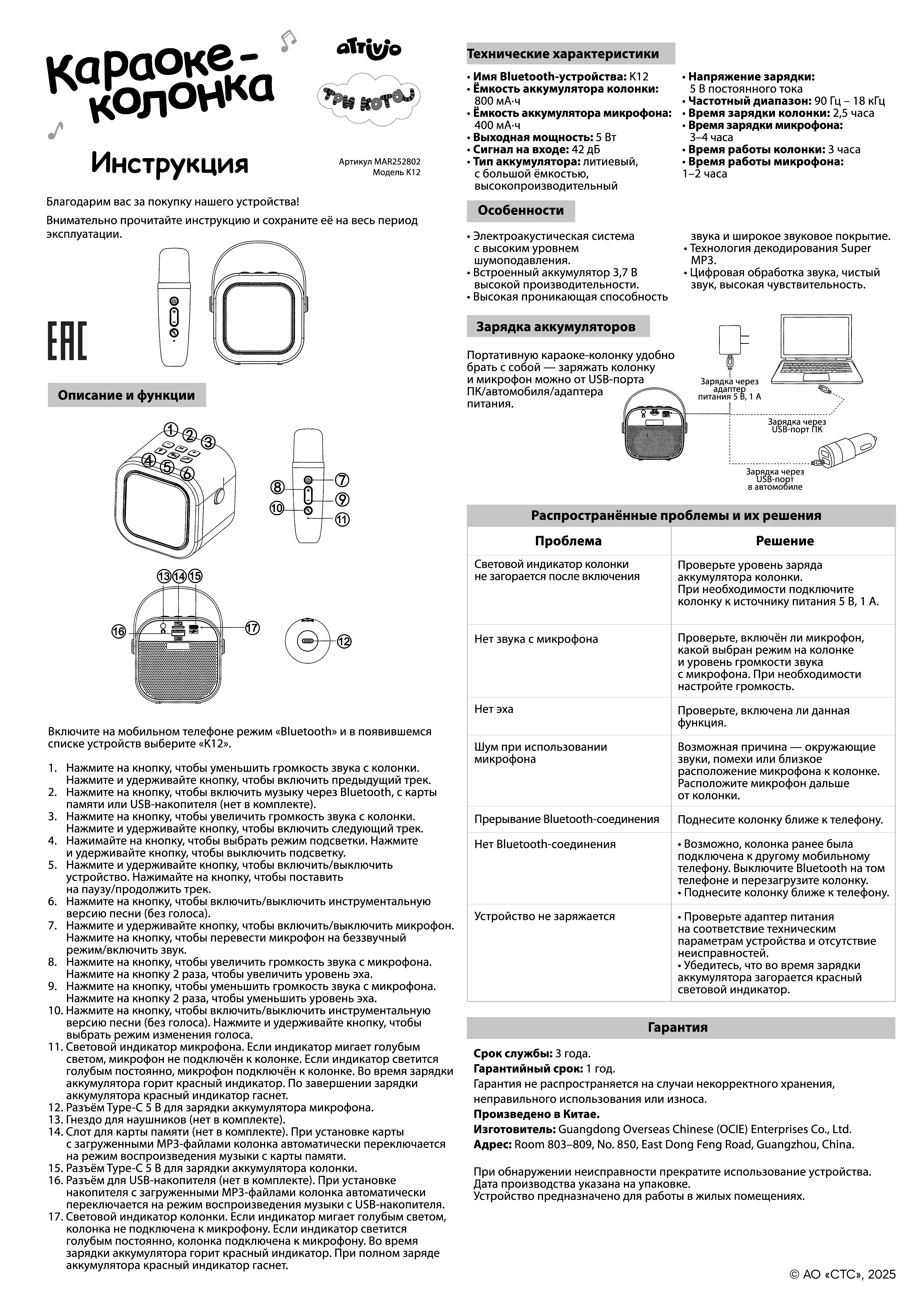Колонка и микрофон работают от встроенных аккумуляторов и заряжаются через USB-кабель (в комплекте). На устройстве закреплён стильный и функциональный ремешок.