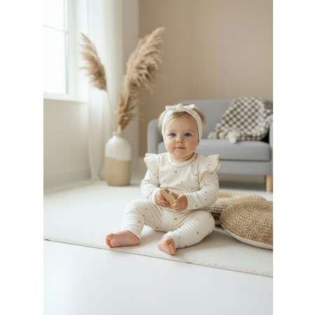 Основной цвет молочный, что создает уютную атмосферу. Узор в виде маленьких сердечек добавляет милоты и игривости. Боди с декор в виде крылышек на плечах придает костюму стильный и элегантный вид. Мягкий хлопковый материал обеспечивает комфорт и свободу движений, идеально подходя как для игр дома, так и для прогулок.