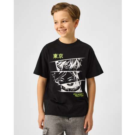 Чёрная футболка для мальчика Futurino с контрастным принтом в стиле аниме.