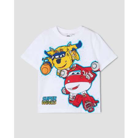 Белая футболка для мальчика Super Wings, декорированная красочным принтом с персонажами мультфильма.