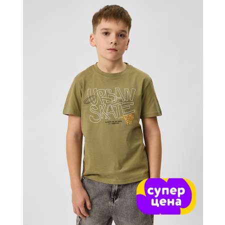 Футболка цвета хаки для мальчика Futurino, декорированная цветным принтом с надписями.