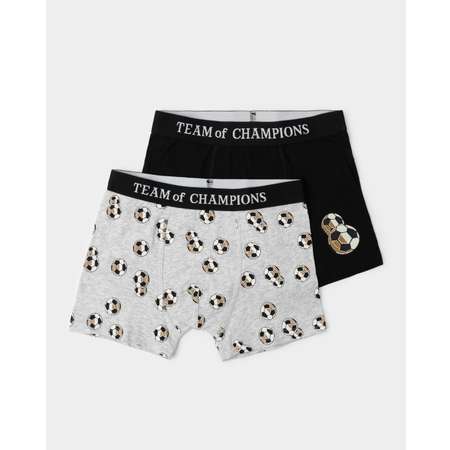 В комплекте Futurino две модели трусов-боксеров для мальчика - чёрные и светло-серые с принтом "Team of champions".