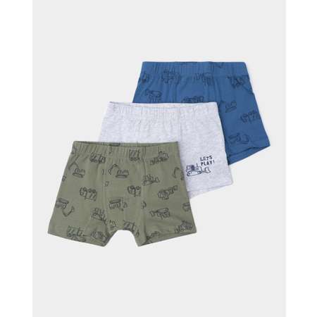 В комплекте Futurino три модели трусов-боксеров для мальчика с однотонным принтом - синие, светло-серые и в цвете хаки.