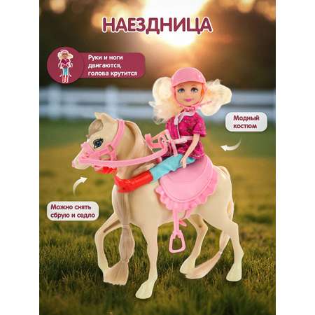 Игровой набор из куклы и лошадки. Игрушки для девочки изготовлены из прочных и безопасных материалов. У куклы подвижные части тела, красивый костюм наездницы. Конская упряжь съемная. Комплектация. Кукла и лошадка. Функционал. У куклы крутится голова. Голова прошита волосами частично. Руки двигаются, отводятся в стороны. Ноги двигаются. Кофта на липучке, снимается. Штаны снимаются. Сапоги снимаются. Шлем снимается, закрепляется ремешком под подбородком. У лошадки снимаются седло и сбруя.