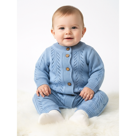 Вязаный ажурный комбинезон для летнего сезона от бренда "Совенок Дона" представляет собой изделие, изготовленное из гипоаллергенного материала. Состав ткани включает 50% хлопка и 50% полиакрилонитрила, что обеспечивает высокий уровень комфорта и безопасности для детской кожи. Комбинезон не имеет подкладки и утеплителя, что делает его подходящим для использования в теплую погоду, а также для выписки из роддома.
