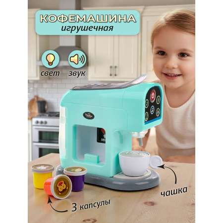 У капсюлей снимаются крышки. Благодаря такой игрушке ребенок будет с удовольствием развивать мелкую моторику рук, координацию движений, воображение, слуховое и зрительное восприятие. Кофемашина работает от 2 батареек АА, входят в комплект. Игрушка изготовлена из высококачественного и безопасного полимерного материала.