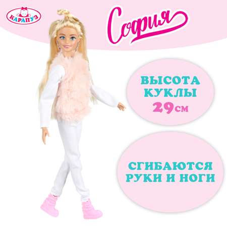 Модница-София одета в меховую жилетку и светлые брюки. Образ дополняют стильные крупные серьги. Одежду и аксессуары легко снять и надеть. С такой модной куклой девочке будет интересно и весело играть: благодаря тому, что руки и ноги куклы подвижны, им можно придать любое положение. У Софии длинные красивые волосы, которые хозяйка куклы сможет заплетать в разные причёски. Детально проработанный дизайн игрушки вдохновит девочку на новые игровые сюжеты.