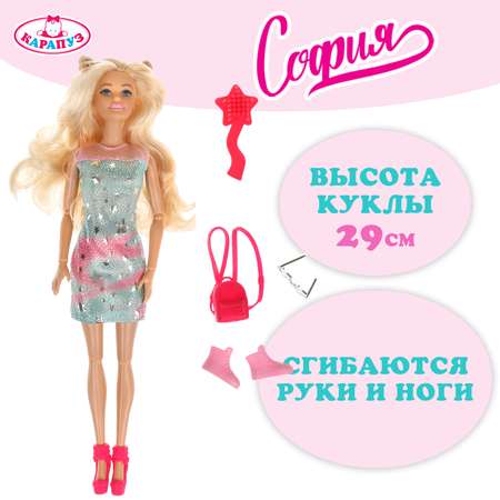 Модница София одета в стильное платье с блестящими звёздами. Образ дополняют элегантные серьги. Одежду и аксессуары легко снять и надеть. С такой модной куклой девочке будет интересно и весело играть: благодаря тому, что руки и ноги куклы подвижны, им можно придать любое положение. У Софии длинные красивые волосы, которые хозяйка куклы сможет заплетать в разные причёски. Детально проработанный дизайн игрушки вдохновит девочку на новые игровые сюжеты.