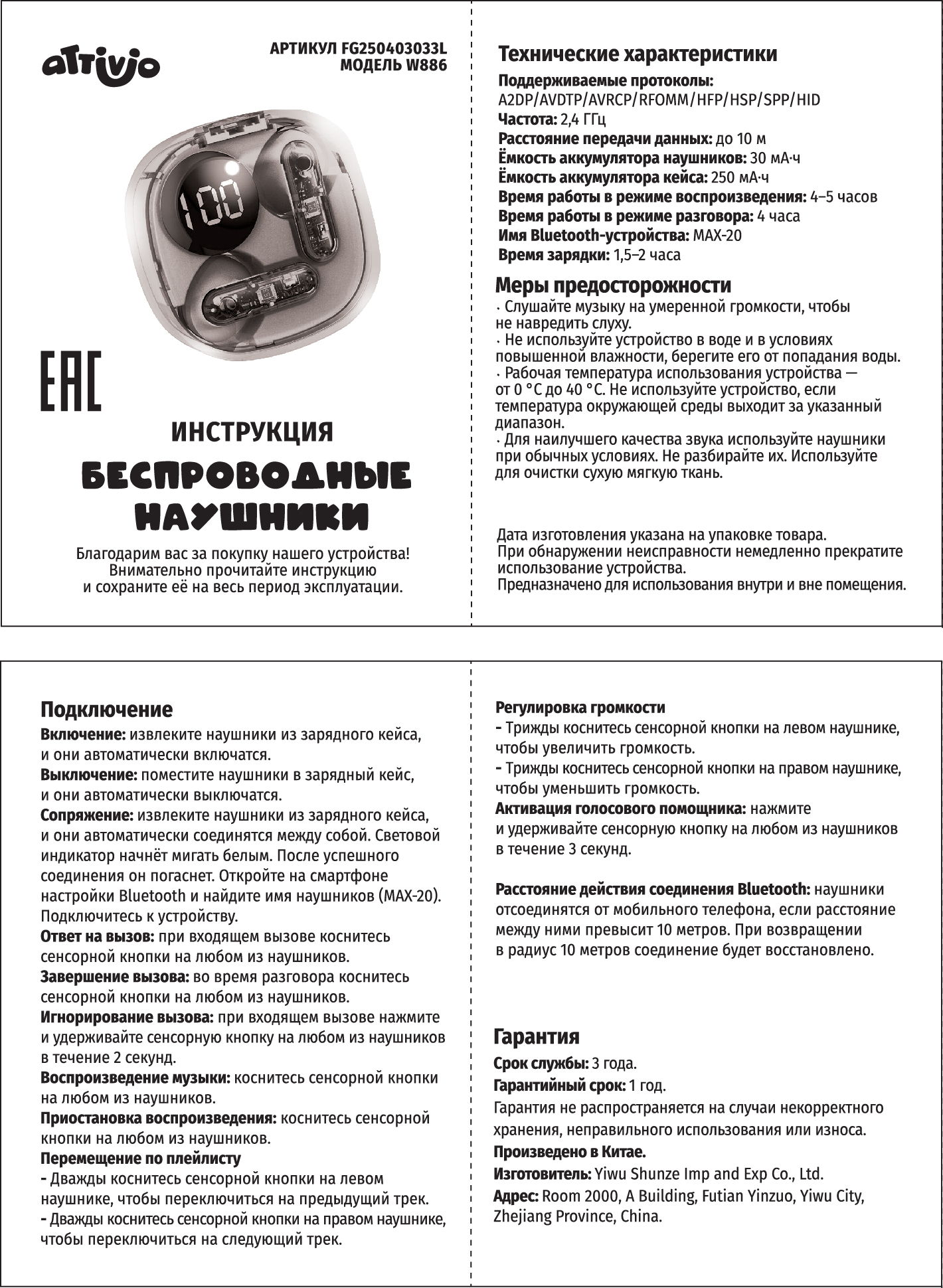 - Ёмкость аккумулятора наушников: 30 мА·ч