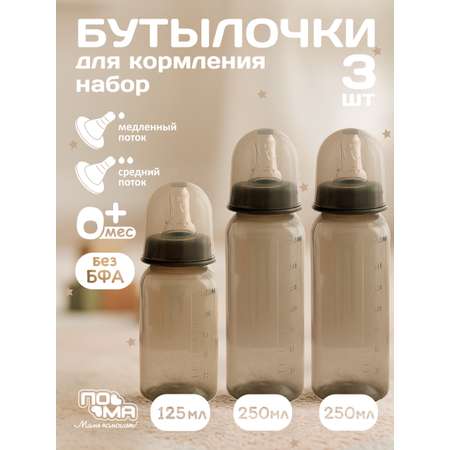 Набор состоит из 2-х штук бутылочек 250 мл и 1-ой бутылочки 125 мл для кормления новорожденных детей с 0 месяцев. Большая и маленькая детская бутылка с классическим (УЗКИМ) горлышком и мягкой антиколиковой соской со средним и медленным потоком максимально комфортна для мамы и малыша.