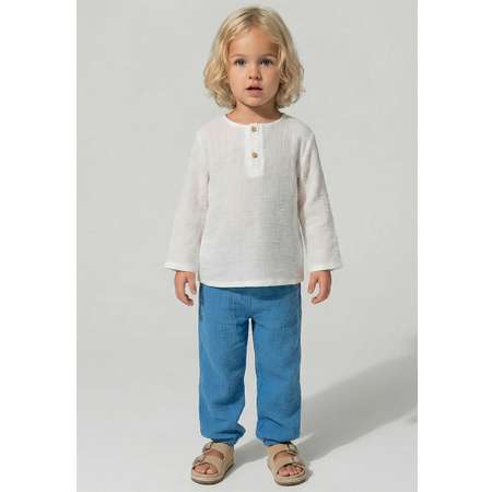 Комплект летний для мальчика из муслина включает в себя джемпер с пуговицами и брюки, пояс на резинке и шнурке, манжетки на резинке.