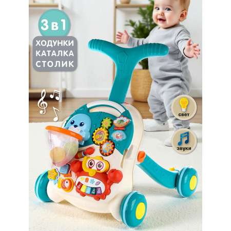 Каталка станет замечательным и очень полезным подарком. Обязательно порадуйте кроху такой симпатичной игрушкой. Игрушка предназначена для детей до 3 лет. Элемент в виде крабика работает от 3 батареек ААА, не входят в комплект. Игрушка изготовлена из высококачественного и безопасного полимерного материала.
