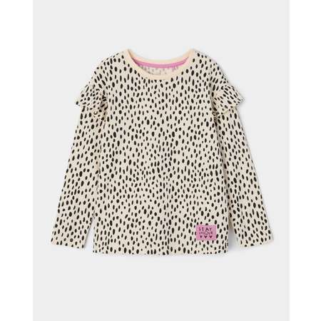 Бежевый лонгслив для девочки Futurino с анималистическим принтом, декорированный оборками и нашивкой.