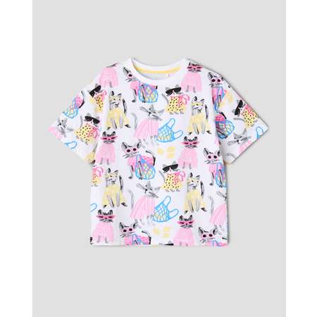 Футболка для девочки Futurino Fashion, декорированная красочным принтом с котиками.