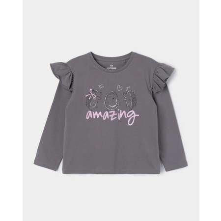 Тёмно-серый лонгслив для девочки Futurino, декорированный оборками и принтом с блёстками.