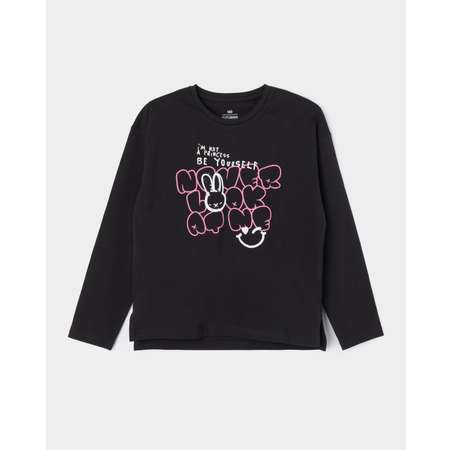Чёрный лонгслив для девочки Futurino, декорированный контрастным принтом с надписями.
