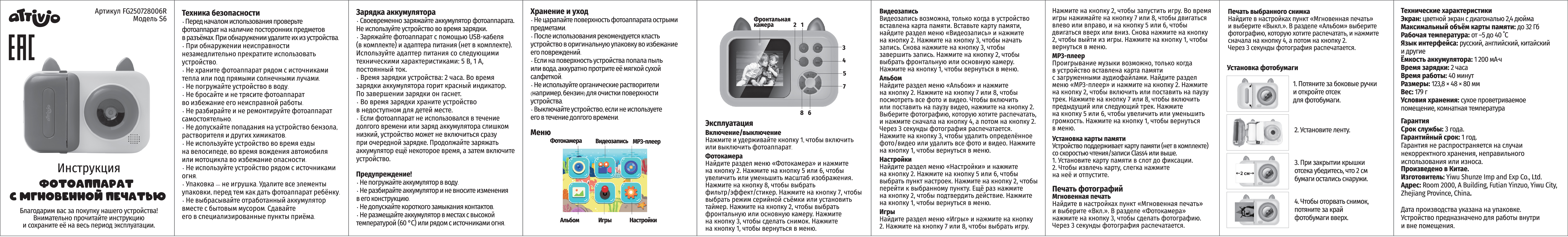 Фотографии удобно хранить в альбоме (в комплекте). Для видеозаписи и воспроизведения музыки потребуется карта памяти (нет в комплекте). На фотоаппарате ещё можно и поиграть в весёлые игры, проверив свою ловкость и смекалку. В комплект входят стильный шнурок и лист со стикерами.