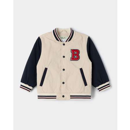Куртка-бомбер для мальчика BabyGo в бежевом цвете, с контрастными рукавами и объёмной нашивкой.