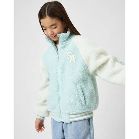 Меховой (плюшевый) бомбер для девочки Futurino в мятном цвете, декорированный нашивками.