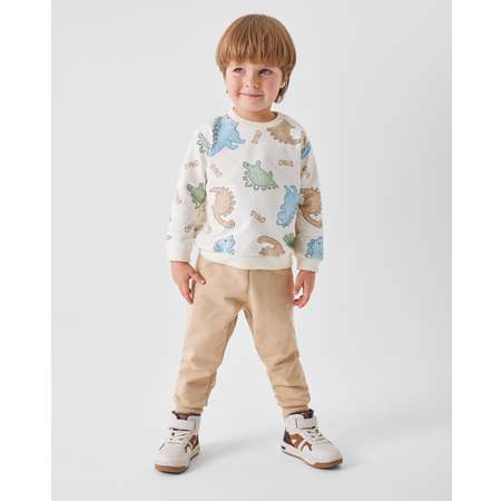 Комплект для мальчика BabyGo из свитшота с динозавриками и бежевых брюк.