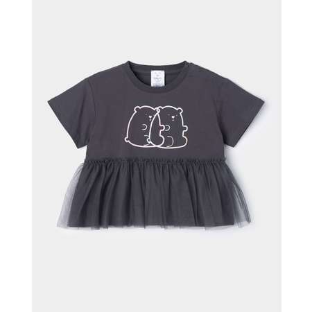 Чёрная футболка для девочки BabyGo Trend, декорированная цветным принтом с мишками и объёмными оборками из фатина.