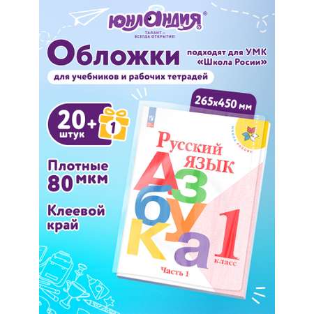 Обложки ПЭ для учебников и рабочих тетрадей ЮНЛАНДИЯ с клеящимся краем – идеальное решение для защиты школьных книг, учебных пособий и даже тетрадей большого формата. Набор из 20 обложек плюс 1 в подарок выполнен из прозрачного полиэтилена 80 мкм, размером 265х450 мм, что подходит для формата А4 и отлично защищает книги, учебники и рабочие тетради "Школа России" от загрязнений и повреждений. Эти обложки для рабочих тетрадей и учебников сохраняют внешний вид школьных материалов и продлевают срок их службы, не содержат вредных для здоровья детей веществ. Позаботьтесь о канцелярии для школы, сделайте учебу максимально удобной и продуктивной!