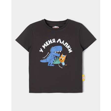 Тёмно-серая футболка для мальчика Три кота, декорированная красочным принтом с Коржиком "У меня лапки".
