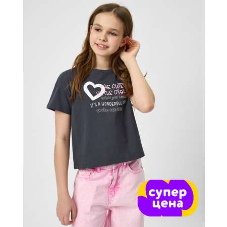 Тёмно-серая футболка для девочки Futurino, декорированная принтом с надписями.