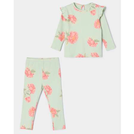 Зелёный комплект с цветочным принтом BabyGо из лонгслива с оборками и легинсов.