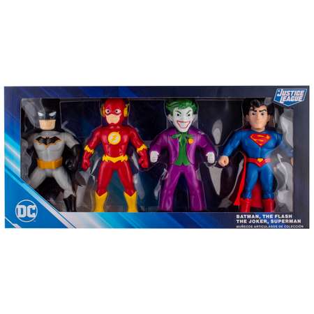 - В набор входят четыре фигурки известных героев вселенной DC – Бэтмена, Супермена, Флэша, Джокера;