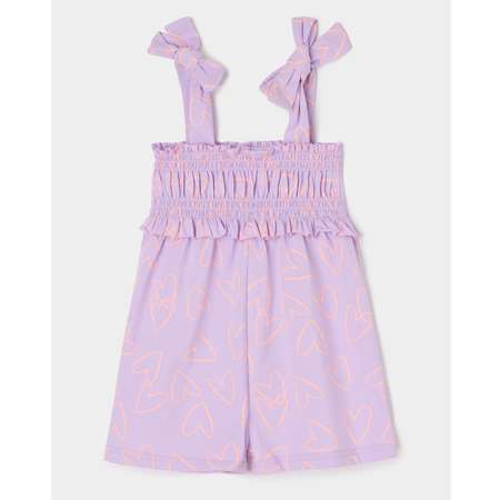 Сиреневый полукомбинезон-шорты для девочки BabyGo, декорированный принтом с сердечками.