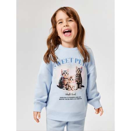 Детский свитшот для девочки изготовлен из футера с небольшим начесом внутри, который обеспечивает тепло в прохладное время года. Модель COMFORT fit отличается свободным кроем, что дарит большую свободу движений во время активных игр. Приспущенная линия плеча и увеличенные объем рукава добавляют луку непринужденный и расслабленный вид. Спереди расположен рисунок в виде милых котиков и надписей "SWEET PETS | ENDLESS CUTENESS AND JOY DEFINE YOUR OWN CAT FRIEND | ADORABLE FRIENDS" [англ. - "Милые животные | Бесконечная милота и радость: найдите своего друга-кота | Очаровательные друзья"], что придает аутфиту стильный акцент. Округлая горловина, манжеты и низ изделия выполнены из рибового полотна, которое обеспечивает лучшее прилегание к телу. Модель представлена в двух цветах: голубом и сером. Комбинируйте свитшот с комплектными брюками (20220460082), чтобы создать очаровательный лук.