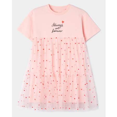 Розовое платье для девочки Futurino, декорированное пышной ярусной юбкой с сердечками.