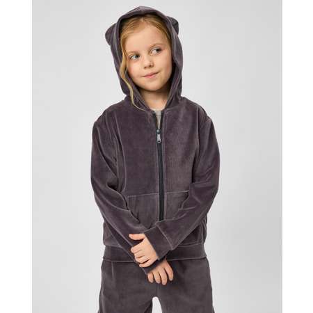 Однотонная велюровая толстовка для девочки Futurino в тёмно-сером цвете, с ушками на капюшоне.