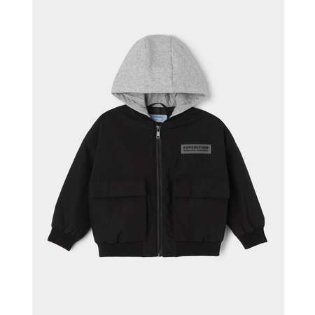 Чёрная ветровка для мальчика Futurino с трикотажным капюшоном. Декорирована нашивкой и надписью на спинке "Expedition".