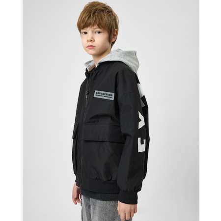Чёрная ветровка для мальчика Futurino с трикотажным капюшоном. Декорирована нашивкой и надписью на спинке "Expedition".