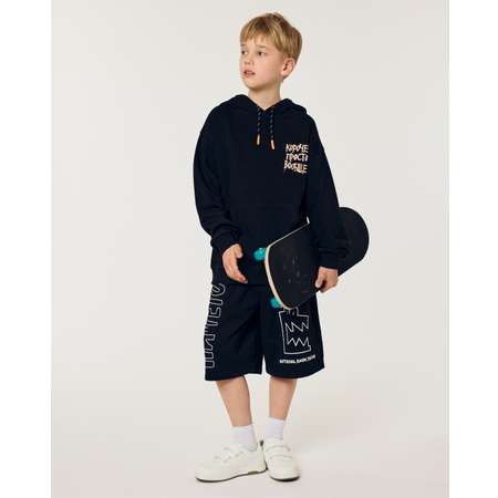 Чёрные шорты для мальчика Futurino Fashion с контрастным принтом "Ничего". Декорированы нашивкой на заднем кармане.