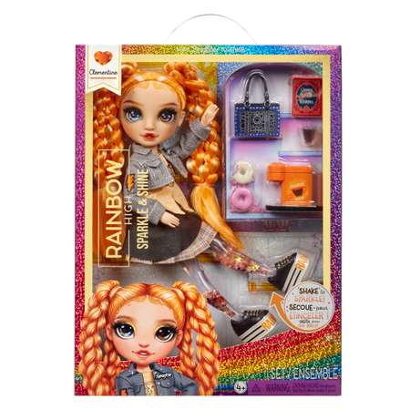 Рейнбоу Хай – это модные куклы премиального качества с детально проработанными аксессуарами. Героини Рейнбоу Хай – творческие личности, показывающие на своем примере, что у каждой девочки есть свой талант, который стоит открыть миру. Sparkle & Shine — это новая сверкающая коллекция. Эти уникально красивые куклы обладают яркой отличительной чертой – их прозрачные ножки наполнены жидкостью с завораживающими блестками! Вы можете встряхивать куклу, как снежный шар, чтобы увидеть, как все блестки в ее ножках переливаются и медленно оседают обратно. Познакомьтесь с Клементиной! Она яркая и жизнерадостная, обожает оранжевый цвет и всегда берет с собой любимую стильную сумочку. Воплоти свои блестящие идеи для игр вместе с Розеттой, Клементиной, Мариной и Виолой! Клементина Sparkle&Shine - это кукла высотой 27 см с длинными густыми прошитыми волосами и длинными ресницами, подвижными ручками и ножками (7 точек артикуляции). В наборе: модная кукла, комплект одежды и обуви, сумка, кофемашина, кружка, книга, 2 пончика, расческа, подставка для куклы. Игрушка изготовлена из полимерных и текстильных материалов и жидкого наполнителя. Товар сертифицирован и безопасен для детского использования. Упаковка: коробка с окном
