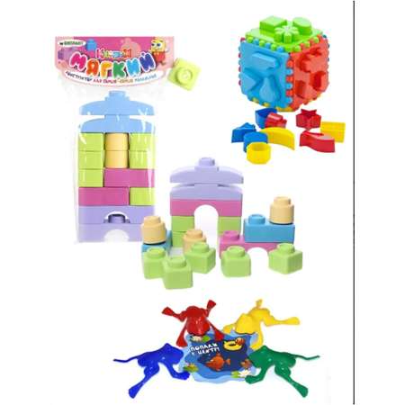 Детский развивающий мягкий конструктор Кнопик 14 крупных деталей + Кубик сортер логический малый + Забавные прыгающие лягушата. Конструктор для самых маленьких. Мягкий конструктор - это игрушки для развития моторики и мышления у детей от года. Развивающий конструктор для малышей легко моется, можно брать с собой ванну. Конструкторы могут быть полезны как для мальчиков, так и для девочек, их можно использовать не только для игр, но и для образовательных целей. Размеры деталей удобны для детской ручки, безопасный материал, детали разной формы, материал легко моется, не боится воды и банных процедур, можно брать с собой ванну. Детали конструктора крупные и при этом очень легкие, выполнены из безопасного нетоксичного прорезиненного пластика, который не обладает запахом. Приобретение конструкторов - это отличный выбор для родителей, которые хотят развивать у своих детей творческие способности, логическое мышление и пространственное воображение. Мягкие конструкторы также могут использоваться для игр в песочнице или в ванной. Такой набор станет отличным подарком для мальчика, для девочки на день рождения, новый год, 23 февраля, 8 марта или просто так. Подойдет как подарок в детский сад. Комплектация: 14 деталей. Кубик - 2 вида 6 и 2 шт. (4х4хсм), длинные детали 2 вида по 2 шт. (12х4х4 см.), прямоугольники - 2 шт. (8х4х4 см.). Упаковка: пакет с картонной ручкой. Размеры упаковки: 12х32х4 см. Возраст 1+. Простая и полезная игрушка для детей от года - логический кубик малый. Когда малыш вставляет геометрические фигурки в отверстия, он учится определять форму и размер предметов, запоминает цвета, развивает логическое и пространственное мышление. Фигурки логического кубика проваливаются внутрь. Размер: 7,5х7,5х7,5 см. Набор из 4 забавных пластмассовых лягушек, игра с которыми развивает мелкую моторику детских пальчиков, сенсорную чувствительность, глазомер, а также способствует снятию стресса. Размер упаковки: 15x9x5 см.