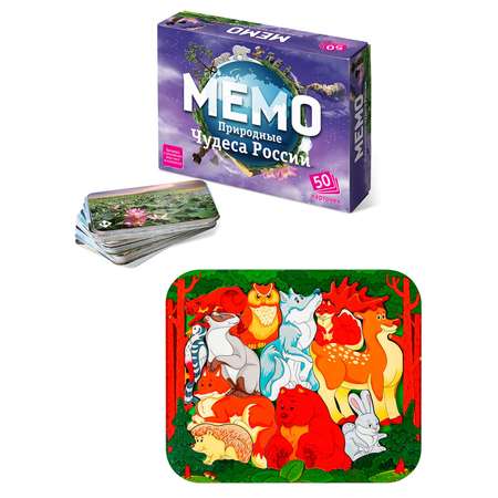 Детский развивающий набор настольных игр Мемо Природные чудеса России + пазл для малышей Зоопазл Лесные жители. Карточная настольная развивающая игра Мемо поможет весело провести семейный вечер или развлечь детей в поездке. Игра "Мемо" состоит из карточек с парными изображениями. Правила игры: Перед началом игры карточки перемешиваются и раскладываются на столе картинками вниз. Играют несколько игроков. В свой ход игрок переворачивает 2 любые карточки и показывает их остальным игрокам. Если карточки одинаковые, игрок забирает их себе и делает еще один ход. Если разные - переворачивает их и кладет обратно, а ход переходит к следующему игроку. Выигрывает игрок, собравший к концу игры наибольшее количество карточек. Зоопазл "Лесные жители" будет способствовать логическому мышлению, мелкой моторике и воображению вашего ребенка. В набор входит 11 фигурок разных животных, которых надо правильно расположить на панели, чтобы пазл сошелся. С детьми маленького возраста это будет отличный дидактический материал, чтобы запомнить основных животных, которые живут в лесу, развить словарный запас и общее представление о флоре и фауне. Мемо - это настольные игры не только для детей, но и для взрослых, для всей семьи, для компаний, для пар. Это игры на развитие памяти, развивающие игры для школьников, умные игры. Можно играть как дома, так и взять игру в дорогу. Размер карточки 9х6,3 см. Возраст 5+.