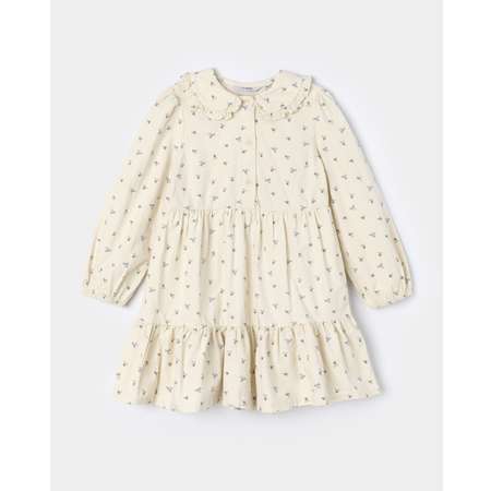 Вельветовое бежевое платье для девочки Futurino с ярусной юбкой. Декорировано нежным цветочным принтом и отложным воротничком с оборками.