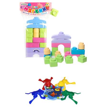 Мягкий конструктор - это игрушки для развития моторики и мышления у детей от года. Развивающий конструктор для малышей легко моется, можно брать с собой ванну. Конструкторы могут быть полезны как для мальчиков, так и для девочек, их можно использовать не только для игр, но и для образовательных целей. Размеры деталей удобны для детской ручки, безопасный материал, детали разной формы, материал легко моется, не боится воды и банных процедур, можно брать с собой ванну. Детали конструктора крупные и при этом очень легкие, выполнены из безопасного нетоксичного прорезиненного пластика, который не обладает запахом. Приобретение конструкторов - это отличный выбор для родителей, которые хотят развивать у своих детей творческие способности, логическое мышление и пространственное воображение. Мягкие конструкторы также могут использоваться для игр в песочнице или в ванной. Такой набор станет отличным подарком для мальчика, для девочки на день рождения, новый год, 23 февраля, 8 марта или просто так. Подойдет как подарок в детский сад. Комплектация: 14 деталей. Кубик - 2 вида 6 и 2 шт. (4х4хсм), длинные детали 2 вида по 2 шт. (12х4х4 см.), прямоугольники - 2 шт. (8х4х4 см.). Упаковка: пакет с картонной ручкой. Размеры упаковки: 12х32х4 см. Возраст 1+. Набор из 4 забавных пластмассовых лягушек, игра с которыми развивает мелкую моторику детских пальчиков, сенсорную чувствительность, глазомер, а также способствует снятию стресса. В зависимости от способа нажатия, игрушки подпрыгивают на месте, скачут вперед или переворачиваются в воздухе. Ребятишки будут веселиться, устраивая соревнования разноцветных прыгунов.